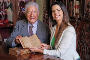 Mariana Leão e o presidente do Real Gabinete Português de Leitura, Francisco da Costa, seguram a primeira edição de Os Lusíadas, de Camões.
